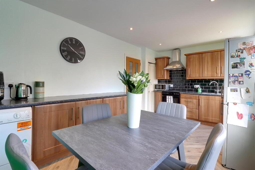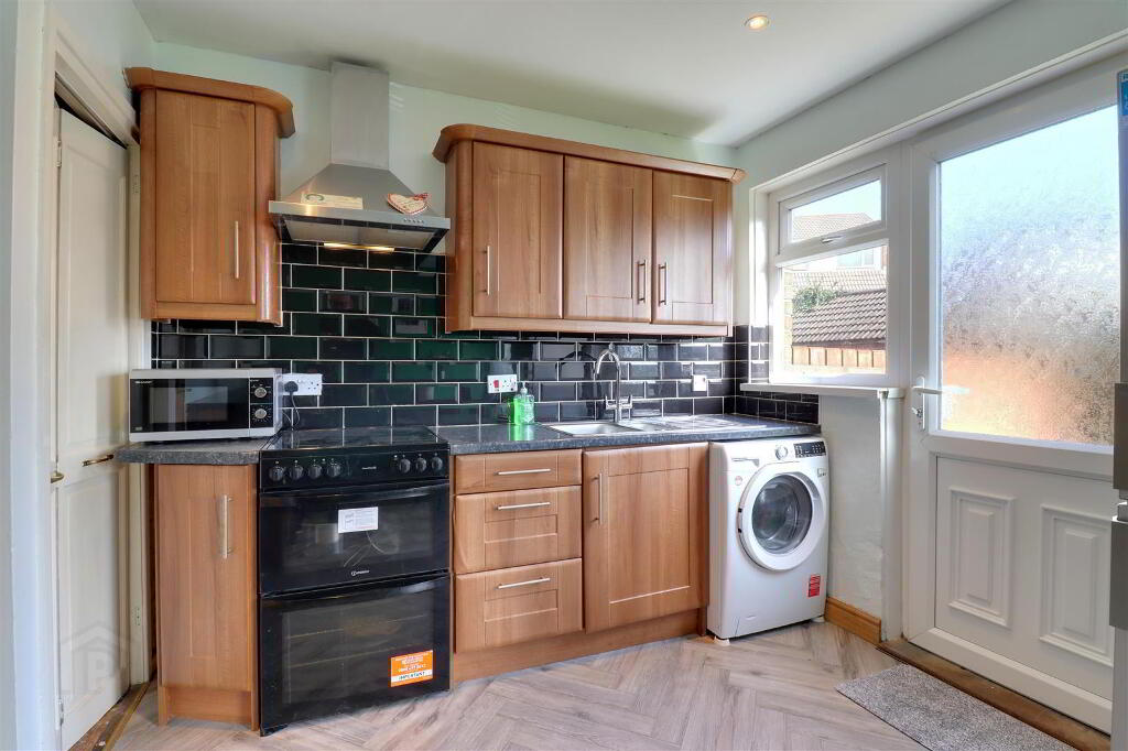 Range of high and low level units in Walnut effect finish with granite effect worktops. 1 1/2 bowl Stainless steel sink with mixer tap. Integrated extractor hood. Plumbed for washing machine. Wood effect laminate flooring. Part tiled walls. Under stairs storage cupboard. Recessed spotlights. uPVC double glazed door to rear garden.