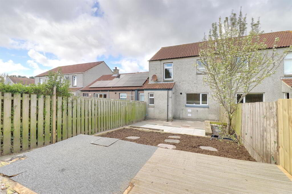 Garden to front with artificial grass and paved communal parking area. Paved patio garden to rear with timber decking and countryside views.