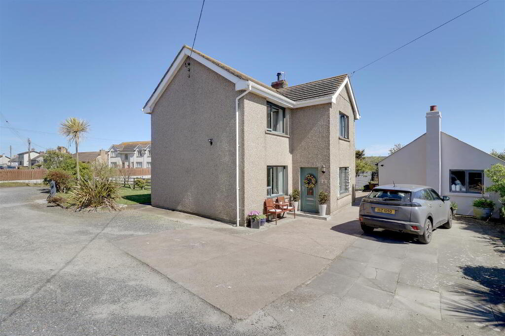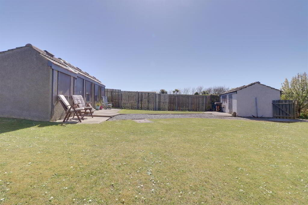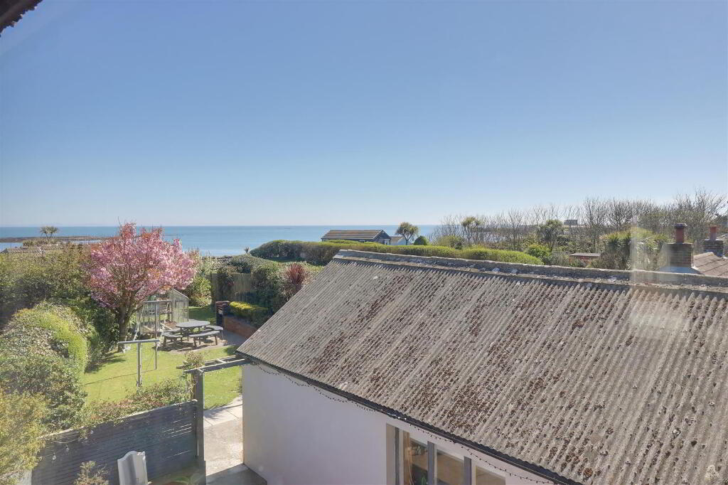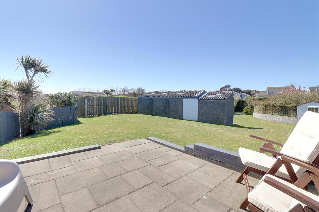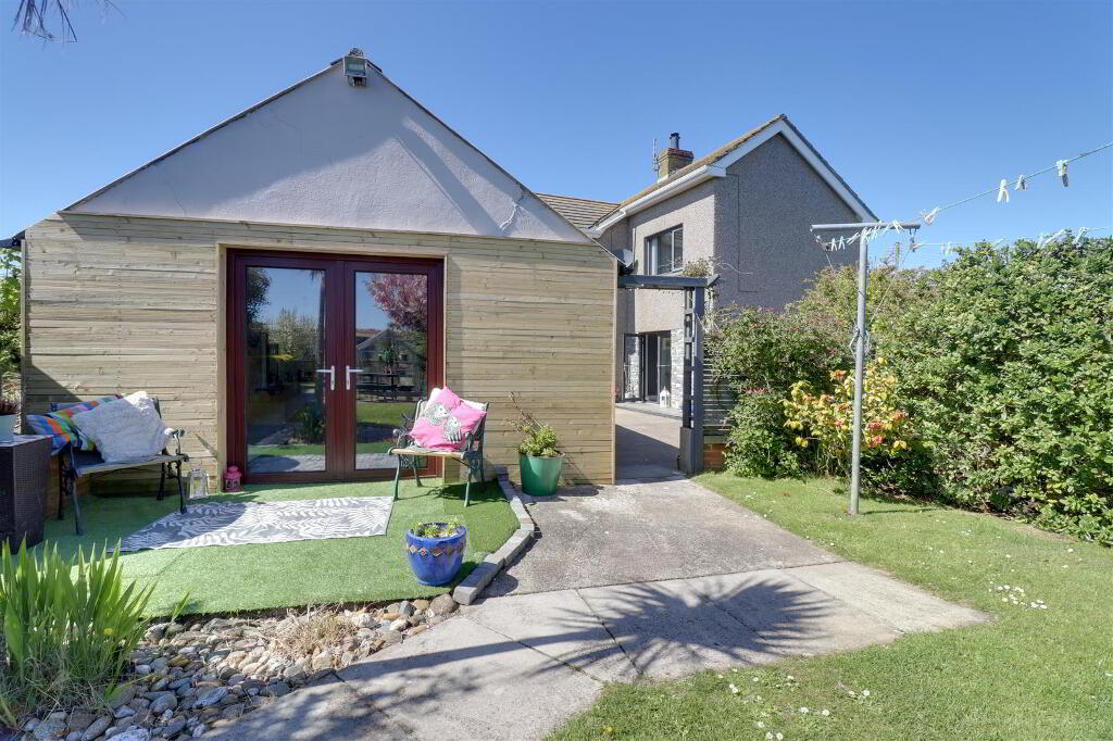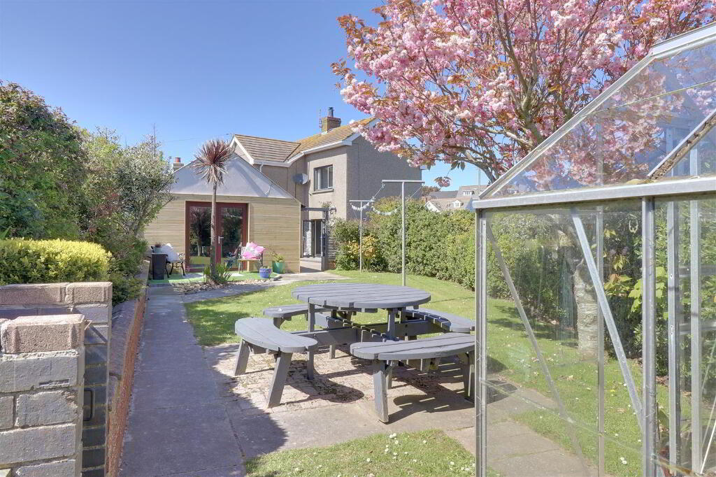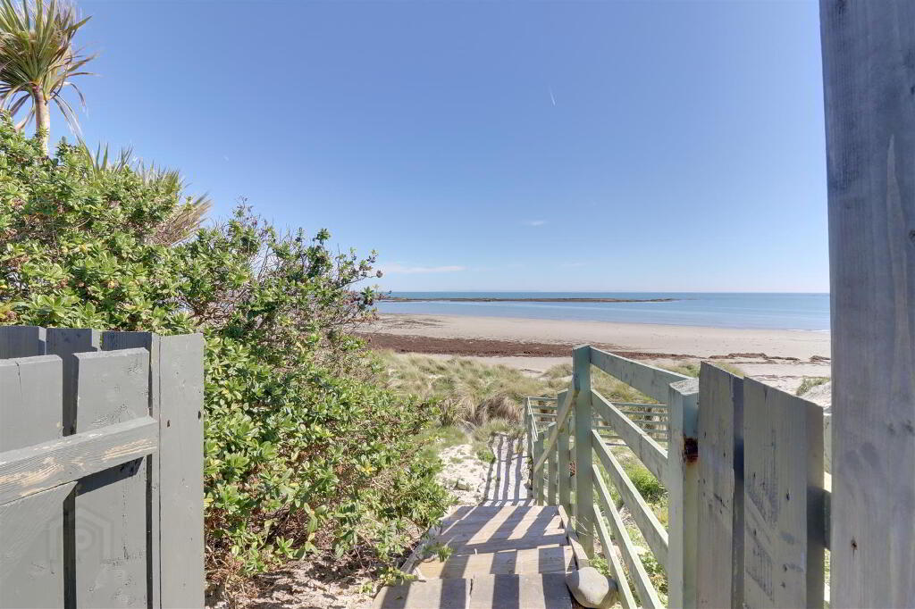 Pebbled driveway with ample parking space. Paved patio area. Garden in lawn to rear, Additional garden to side leading to the beach with range of brick and wooden storage sheds & workshops. Paved patio overlooking the beach. Gate and wooden steps to promenade and beach. Light & tap.