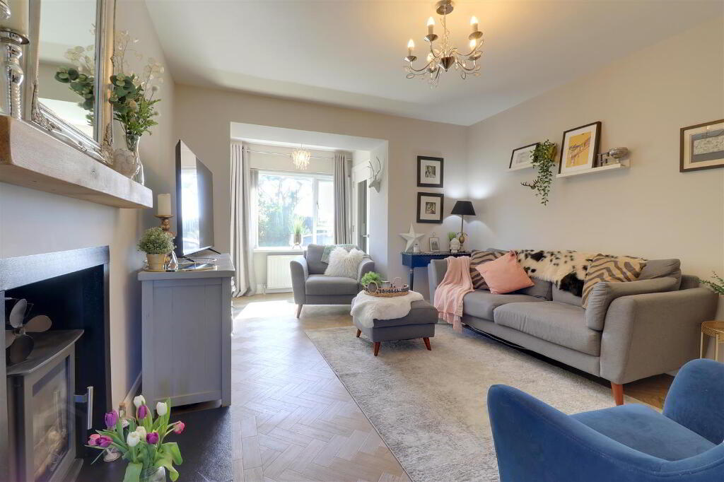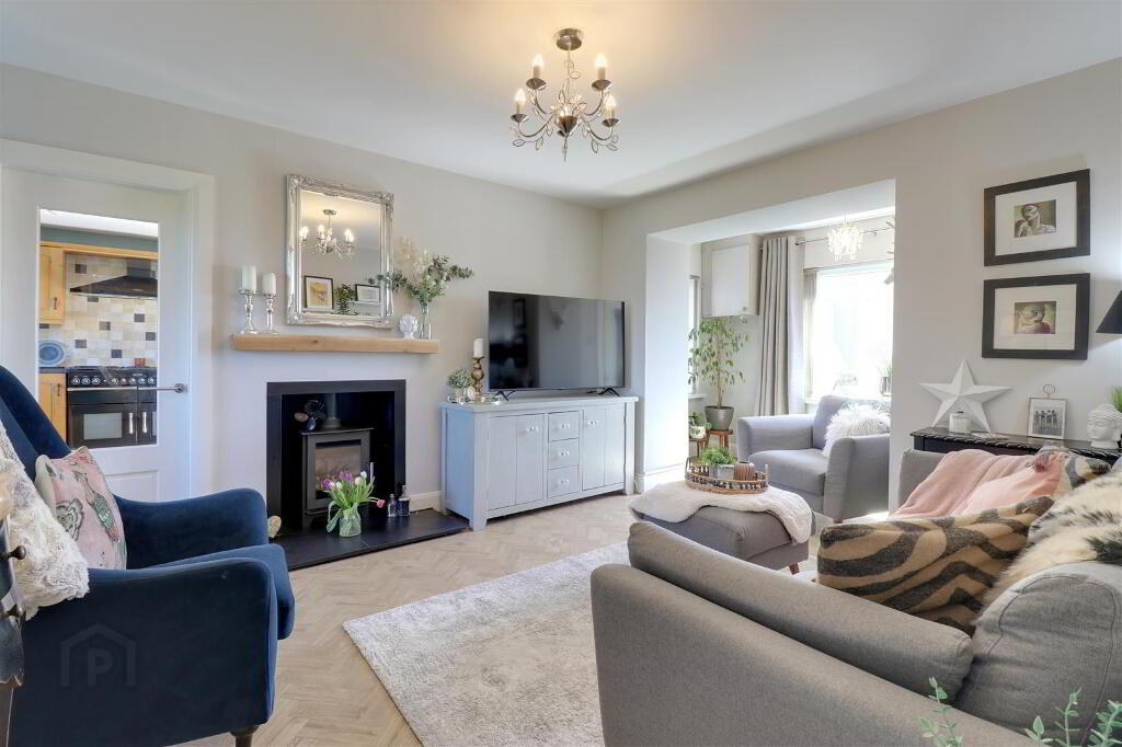 At widest points. Parquet floor. Multi fuel stove with slate hearth. Stairs leading to first floor landing. Glazed door to kitchen.