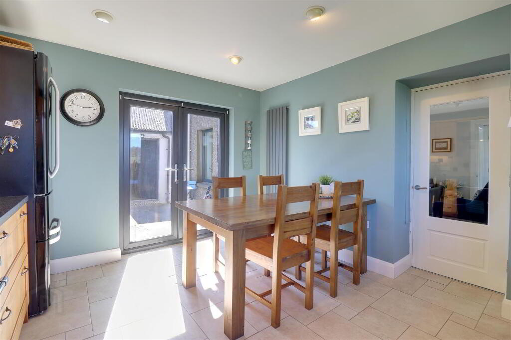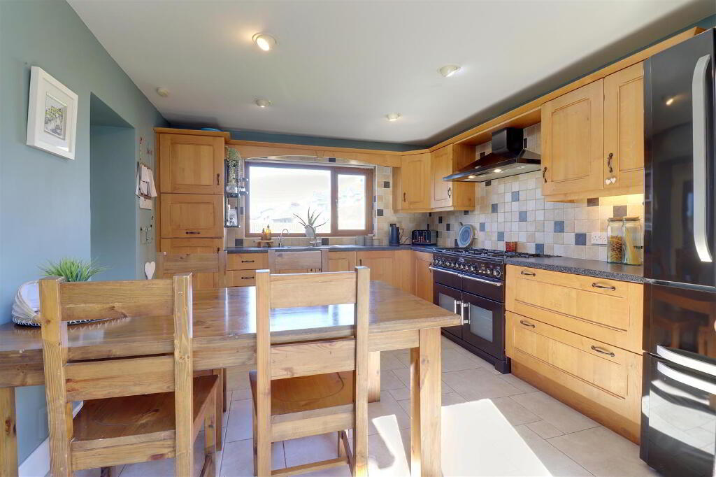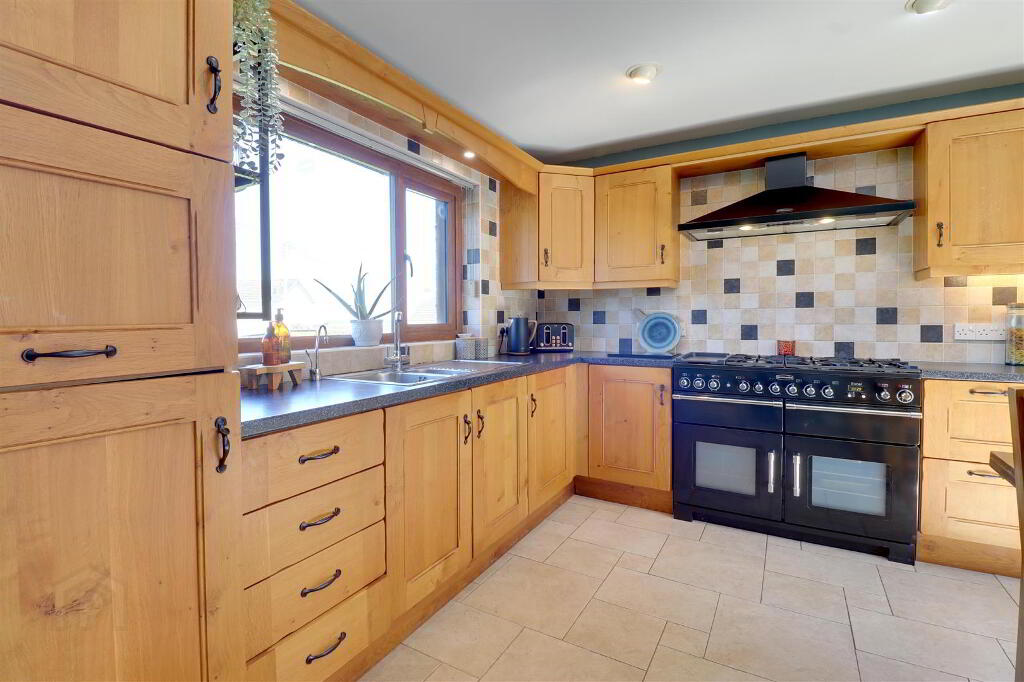 Range of high and low level Oak units with granite effect work top. Stainless steel 1 1/2 bowl sink with mixer taps. uPVC double glazed doors leading to rear garden. Tiled floor. Part tiled walls. Recessed spotlights.