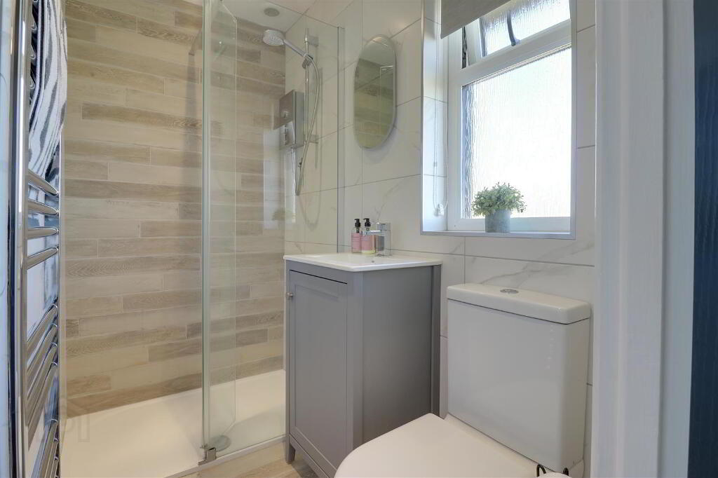 Tiled shower cubicle with electric shower. White suite comprising WC and wash hand basin with vanity unit. Fully tiled. Chrome heated towel rail. Recessed spotlights.
