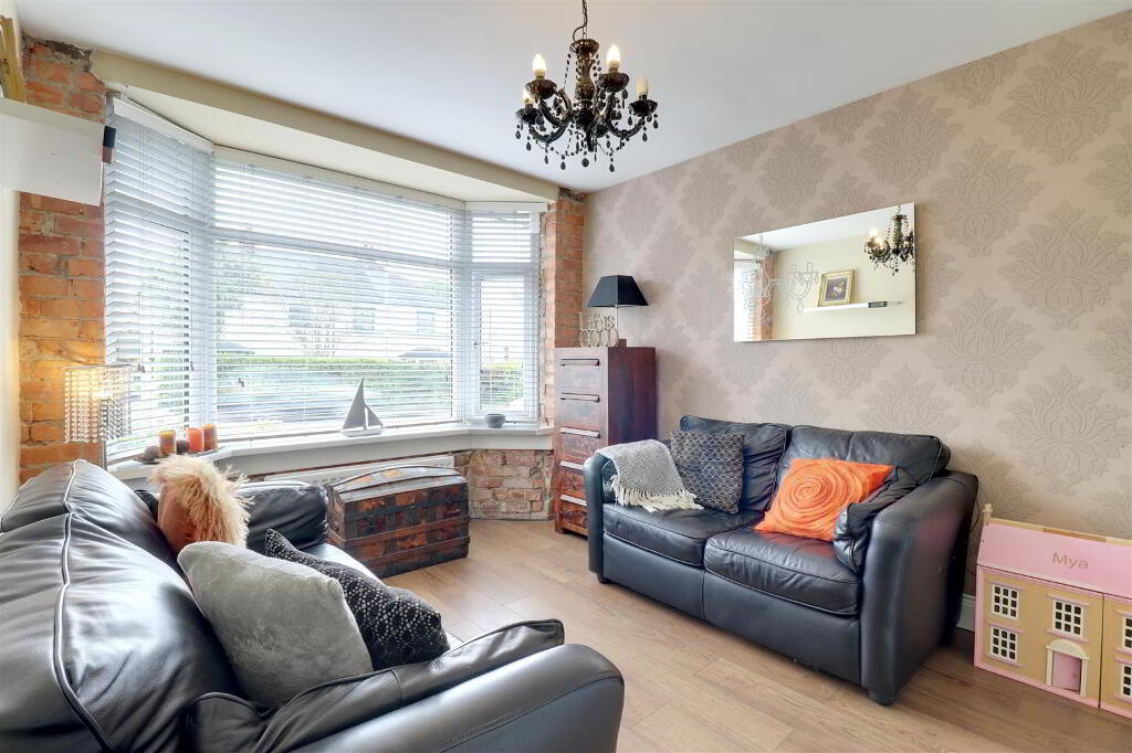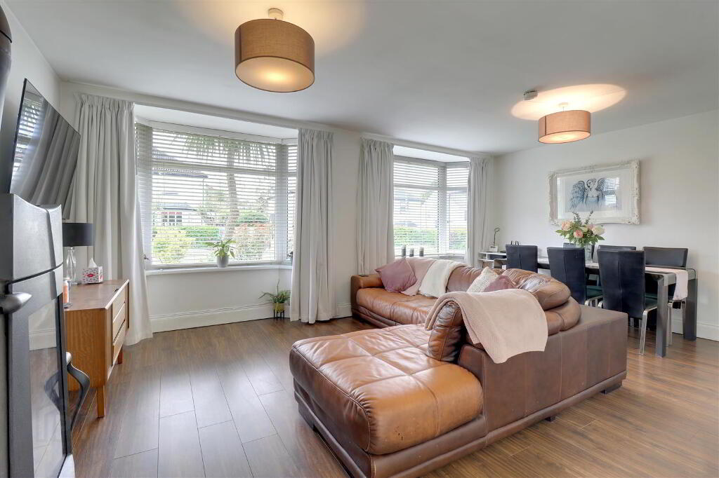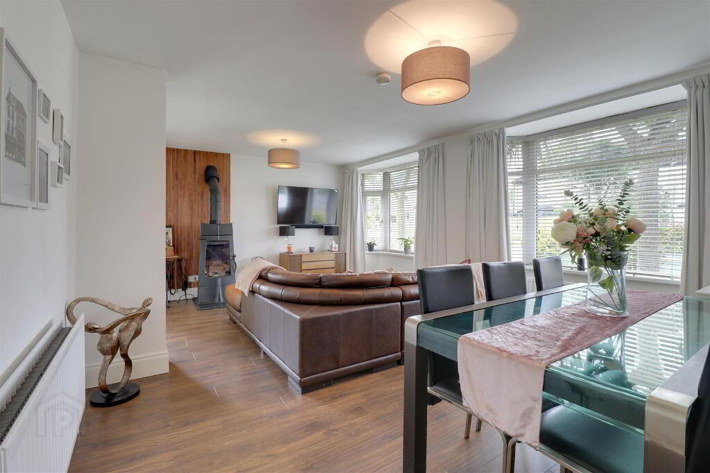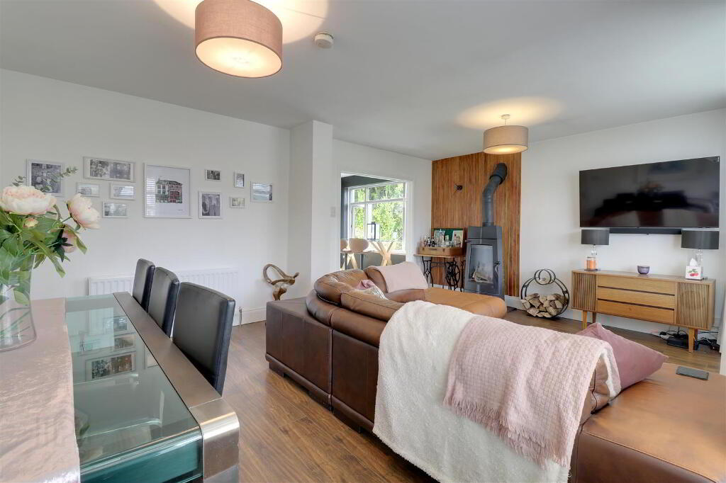 Wood effect laminate floor. 2 bay windows. Feature wood burning stove with slate hearth. Open plan to kitchen.