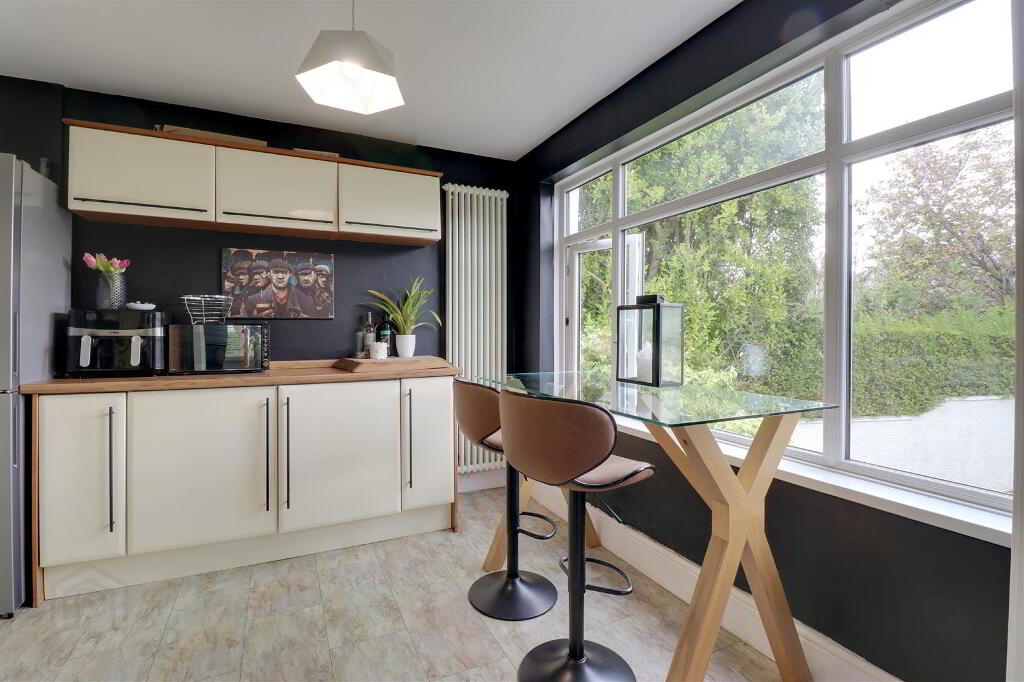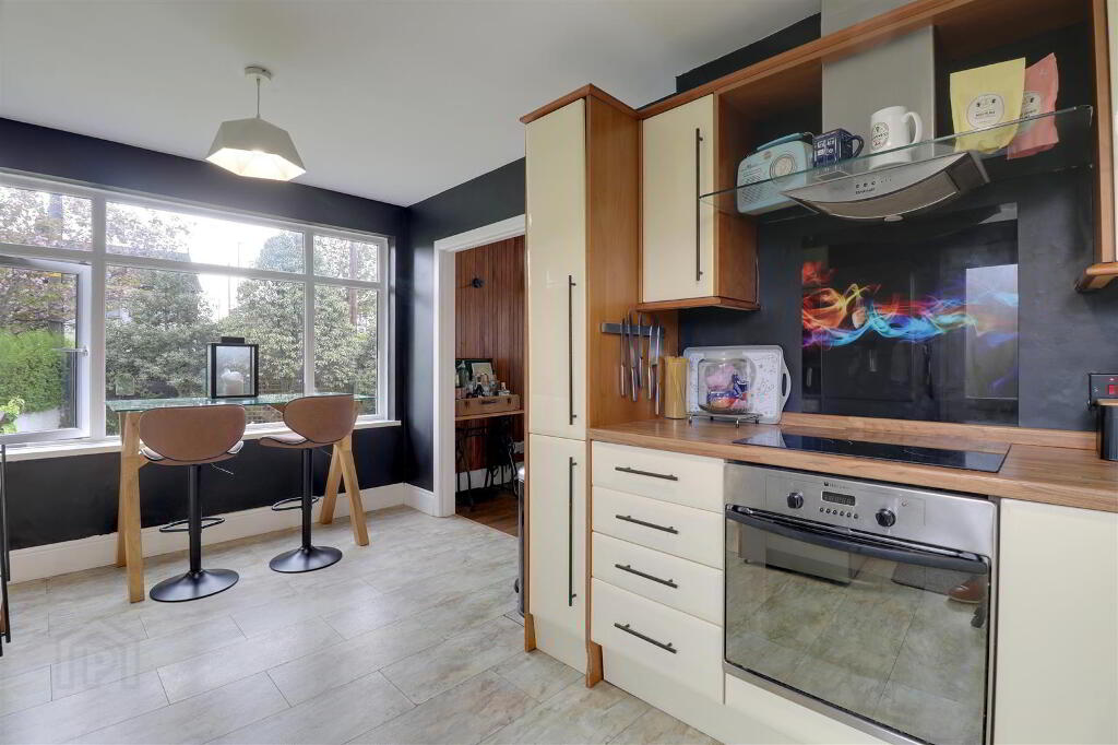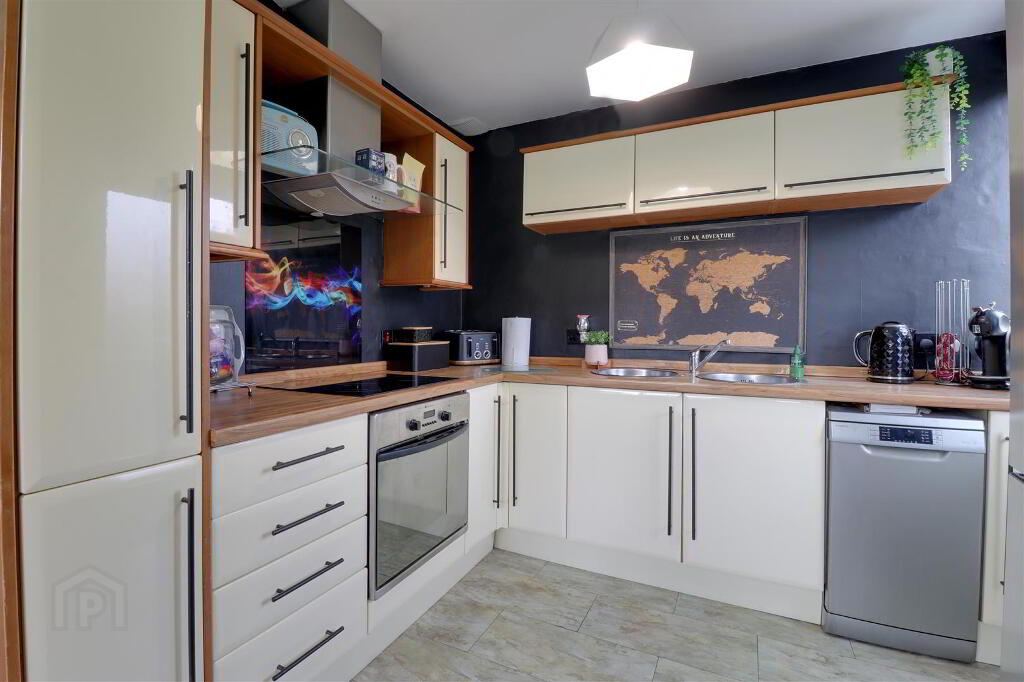 Range of high and low level gloss cream kitchen units with wood effect work top. Integrated oven hob and extractor fan. Stainless steel sink with mixer taps. Plumbed for dishwasher. Feature wall radiator. Tile effect laminate floor. uPVC double glazed door to rear garden.