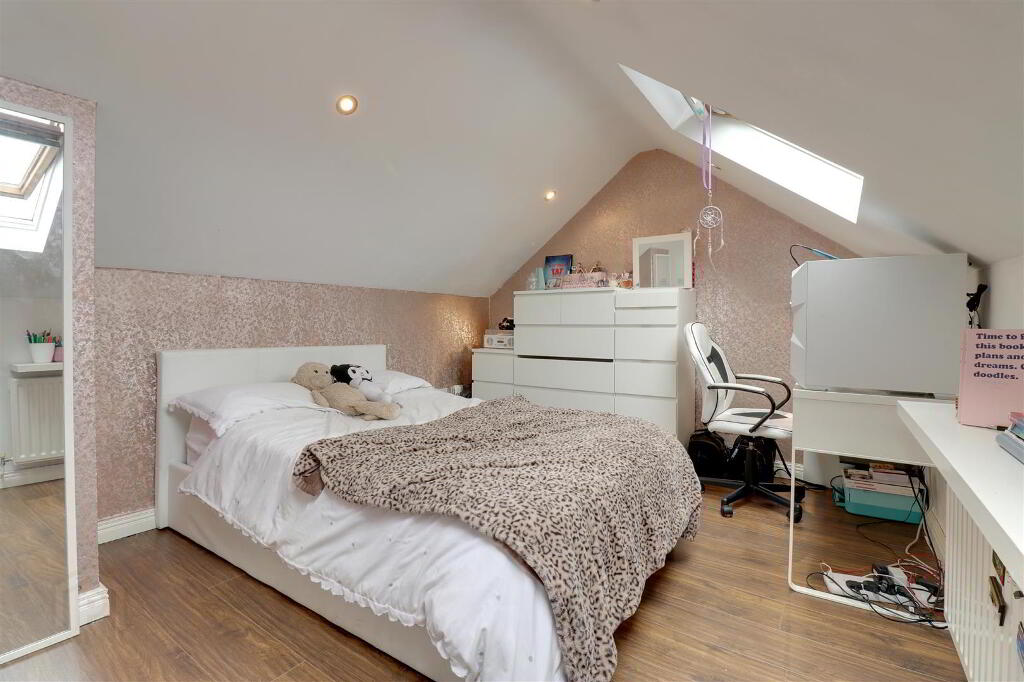 At widest points. Wood effect laminate floor. 2 Velux windows. Slide door wardrobes. Under eaves storage. Recessed spotlights.