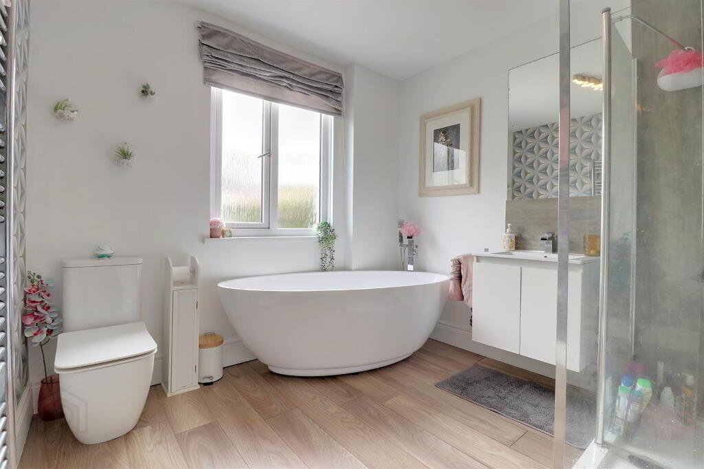 Shower cubicle with thermostatic rain shower. White suite comprising free standing bath, WC and wash hand basin with vanity unit. Chrome heated towel rail. Wood effect laminate floor.