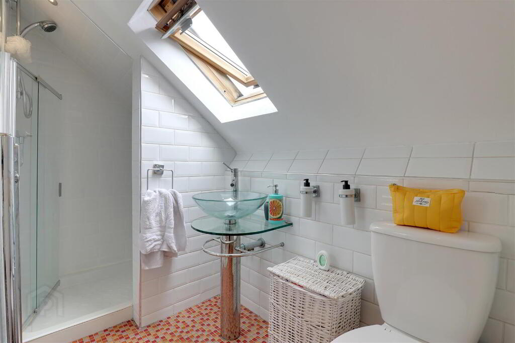 Shower cubicle with thermostatic shower. WC and feature wash hand basin. Velux window. Chrome heated towel rail. Recessed spotlights Fully tiled.