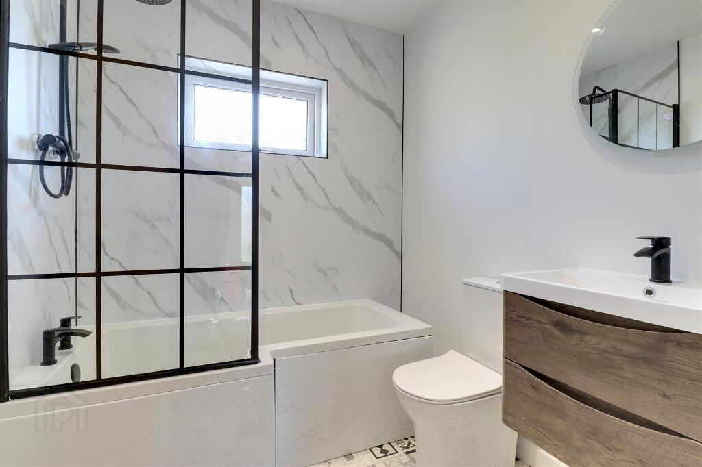 White suite comprising 'P' bath with black 'Rain shower' and shower screen, WC and wash hand basin with vanity unit. Wall paneling. Extractor fan. Recessed spotlights.