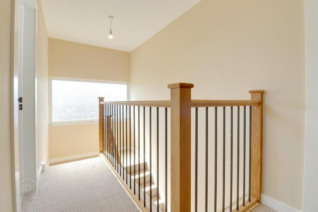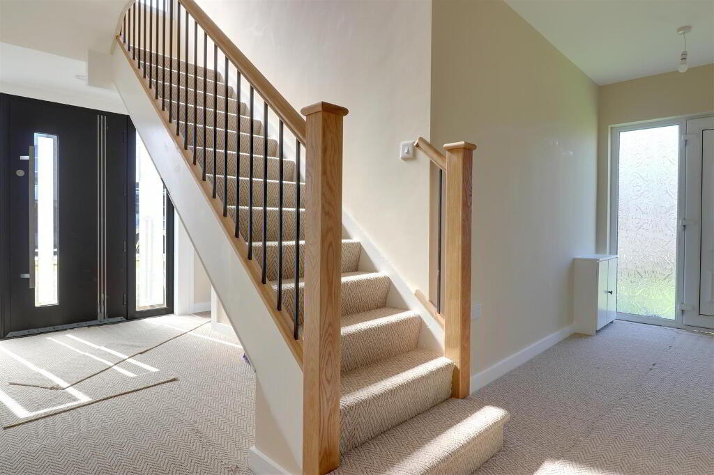 Storage cupboard. Stair case leading to first floor landing with oak and steel hand rail. Side entrance with composite door and twin side panels.