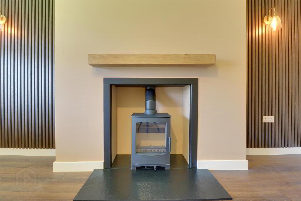 Cast iron stove with slate hearth and wooden mantle. Wood effect laminate floor. Wall lights.