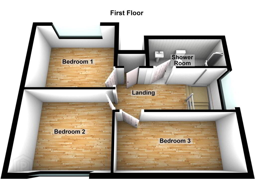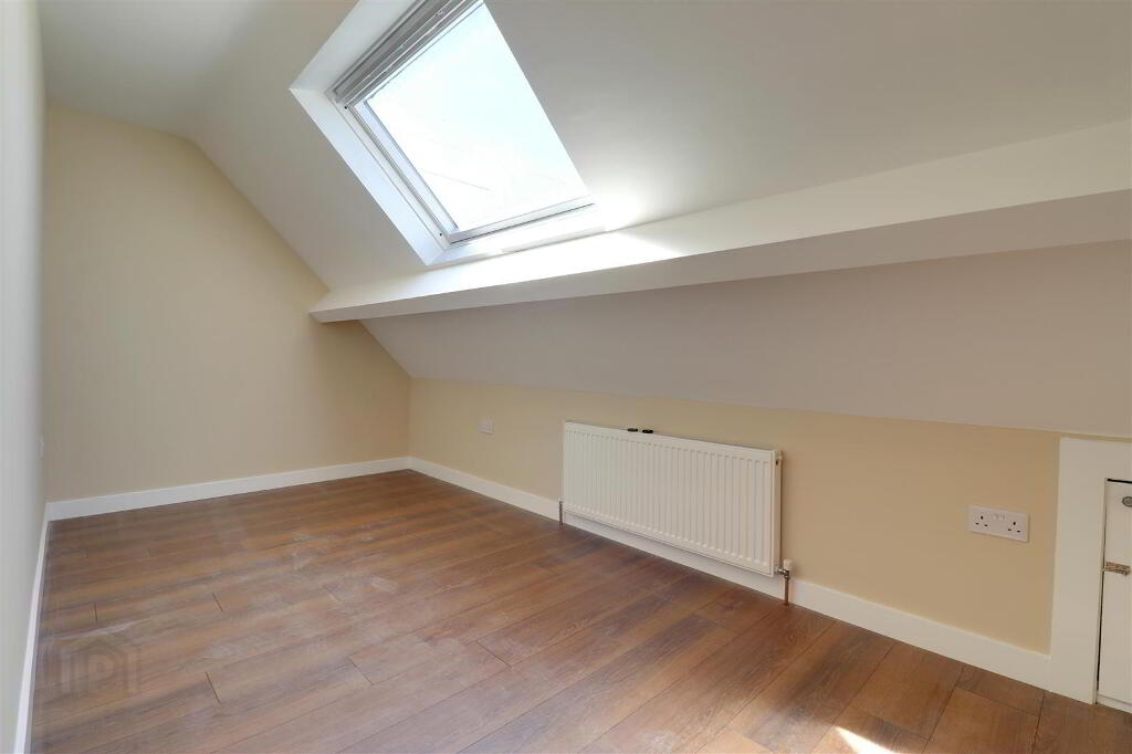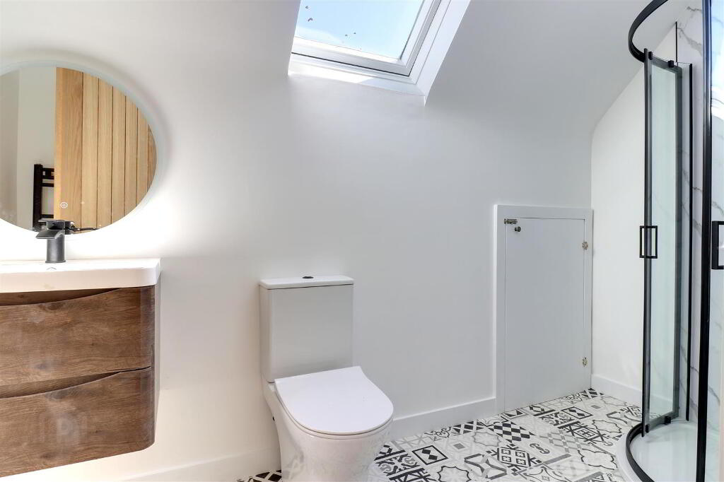 Corner shower with black thermostatic 'Rain' shower. White suite comprising WC and wash hand basin with vanity unit. Heated towel rail. Recessed spotlights. Velux window. Under eaves storage.